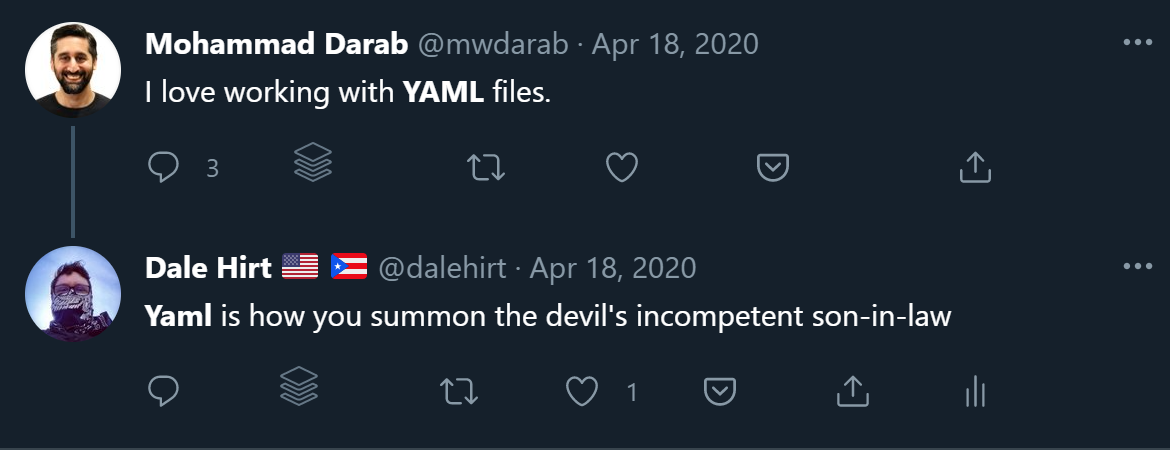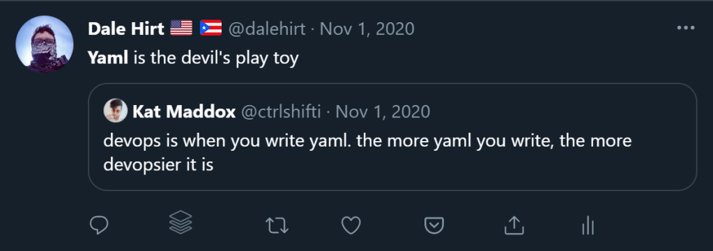 Sixth, Azure DevOps. Specifically, pipelines and YAML. Now, everyone knows I hate #yaml (see examples below), but I have to do it for my day job. And I’m reasonably good at it. So start here and have fun. I’m sure I’ll post examples soon enough.