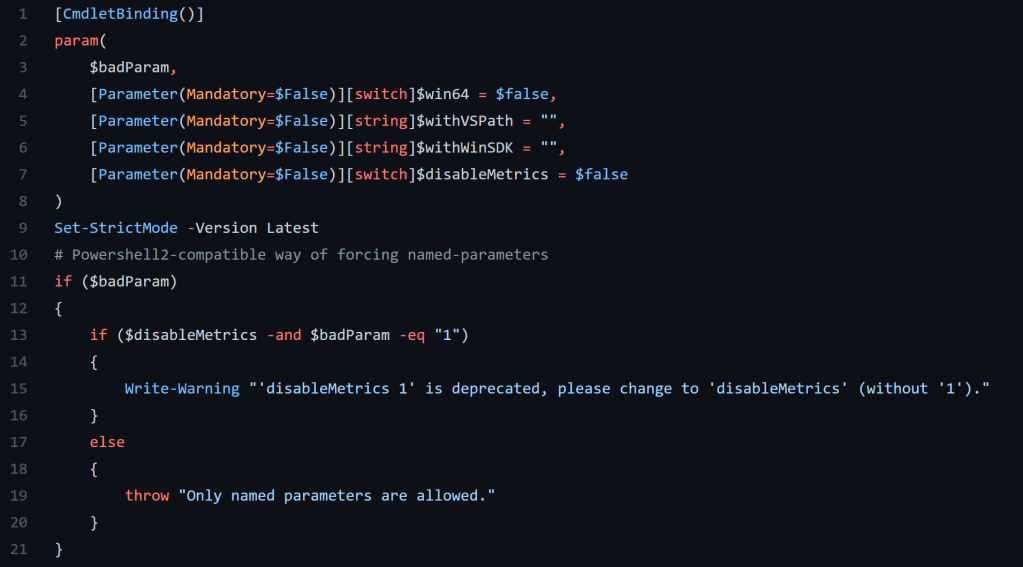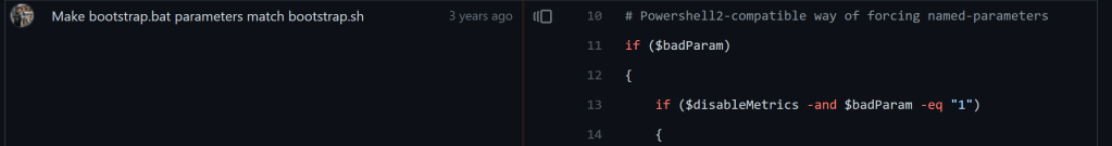 This is where the fun bit begins. Line 11 checks to see if $badParam has been set, which will happen if you call this code thusly “bootstrap.ps1 blah”. It auto-assigns “blah” to $badParam. Now we know no one would willingly assign to $badParam so that means they aren’t using named parameters. We then throw an error on line 19.