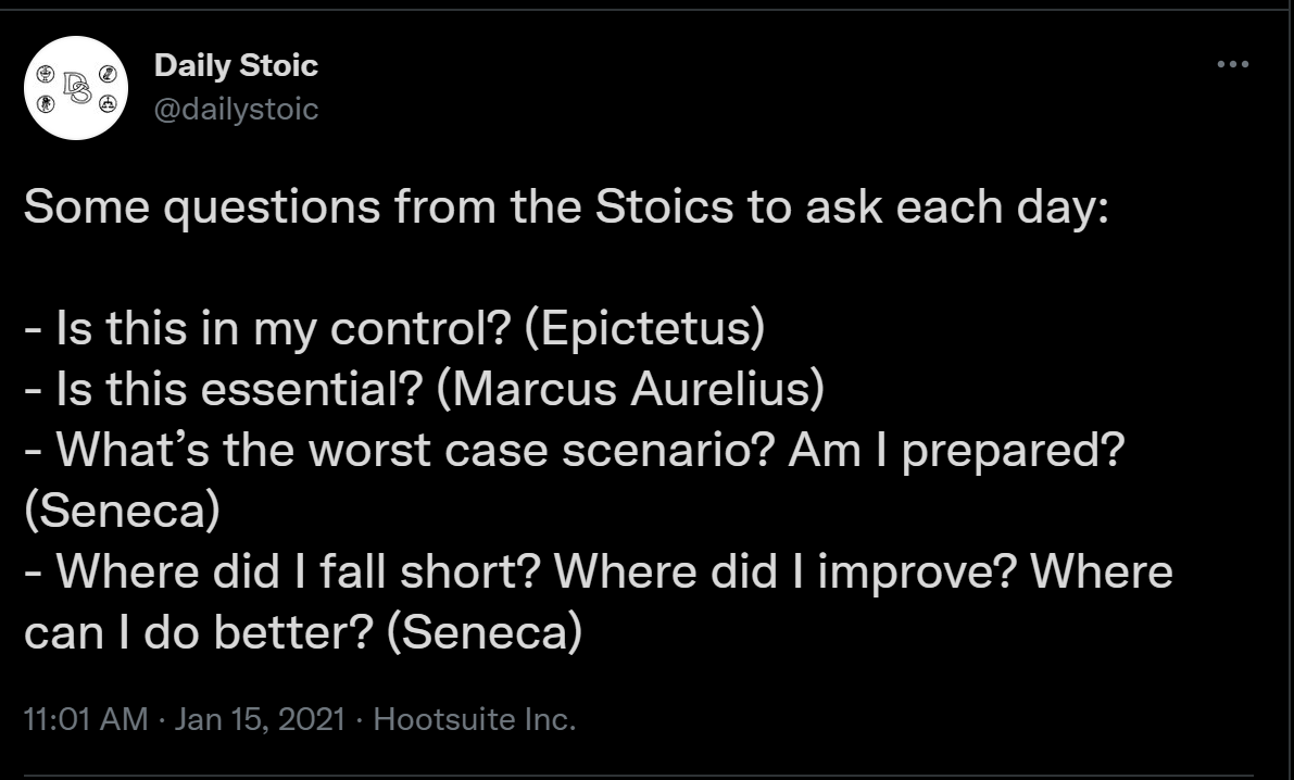 Our world is an insane mess and there is so much out of our control. I personally take heart from stoicism and always ask myself 4 basic questions.