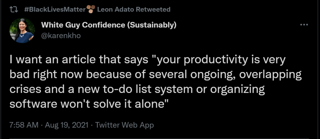 So I’m here to tell you that your productivity is bad right now because of several ongoing, overlapping crises and a new to-do list system or organizing software won’t solve it alone.