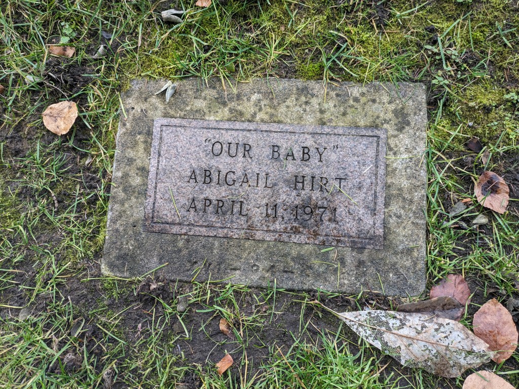 I also had the opportunity to visit my older sister’s grave. She was stillborn (I believe), and I have named one of my kids after her. I wish I had gotten to know her. Rest in Peace, Abigail Hirt. Your namesake is carrying on with greatness and dignity.